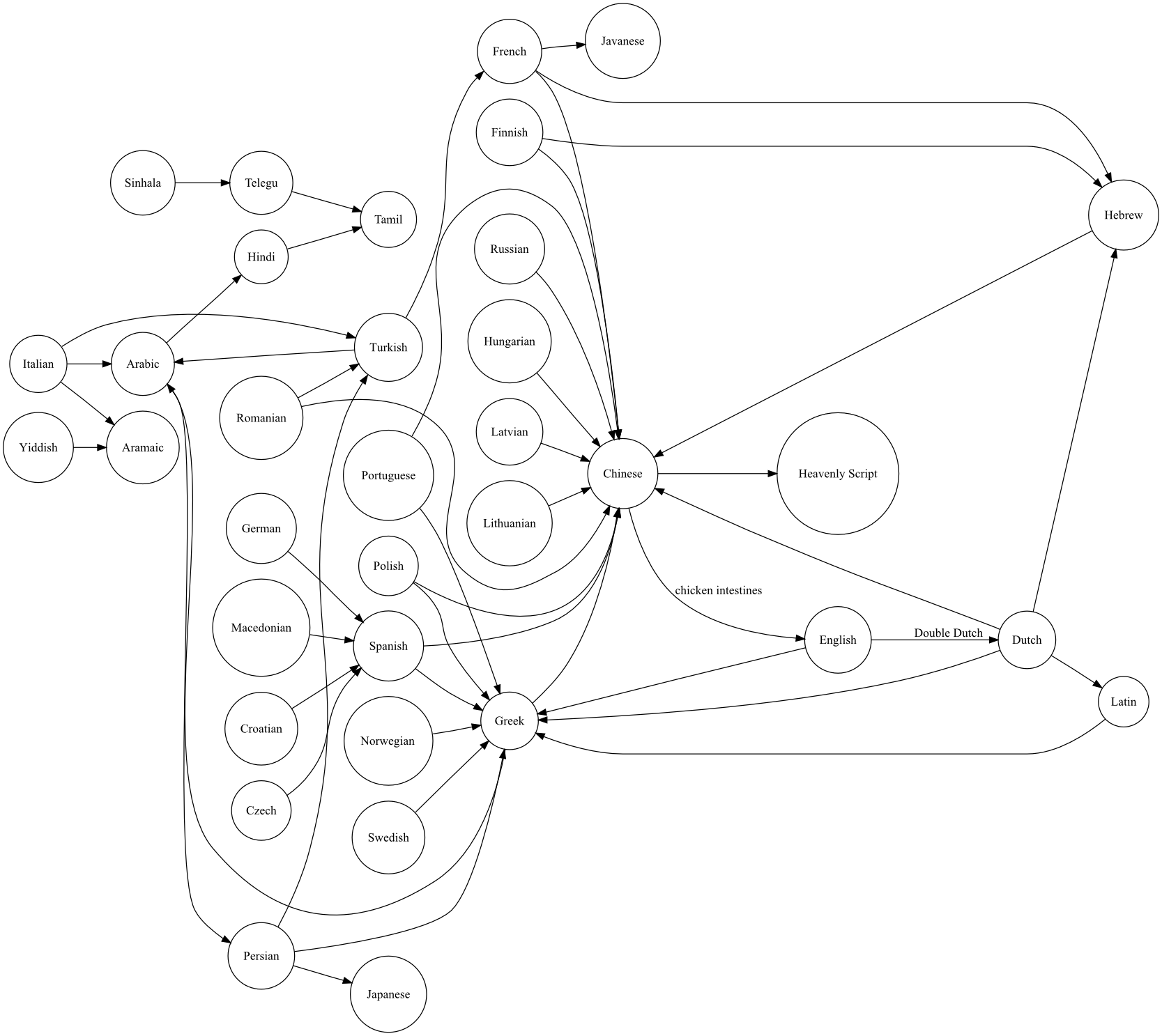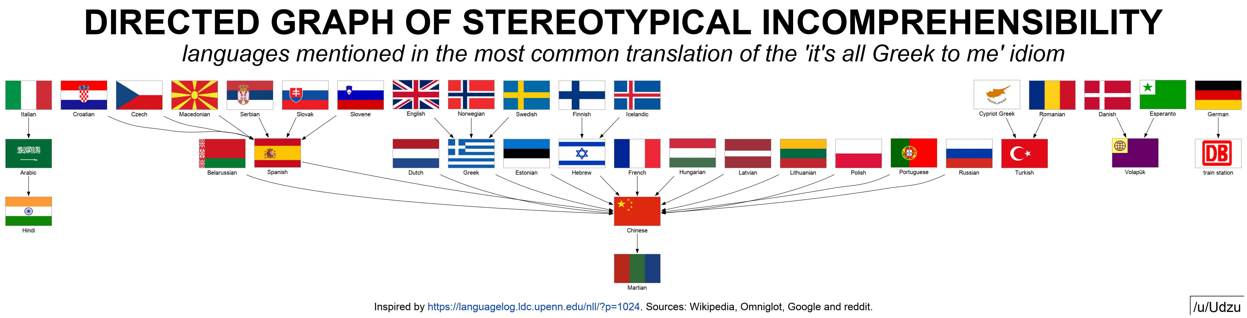 In English, when people don’t understand what you are saying, they might say “it’s Greek to me”. We can represent this relationship with a direct edge from an English node to a Greek node. This Wikipedia page collects similar idioms in various languages. We can construct a graph from this!