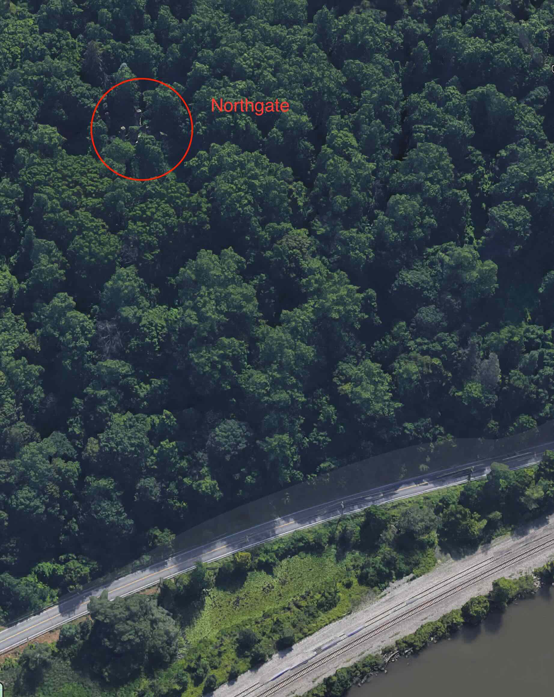 Northgate Manor is located in Hudson Highlands State Park Preserve. In Google Maps satellite imagery, the crumbling walls are almost completely submerged in the surrounding forest.