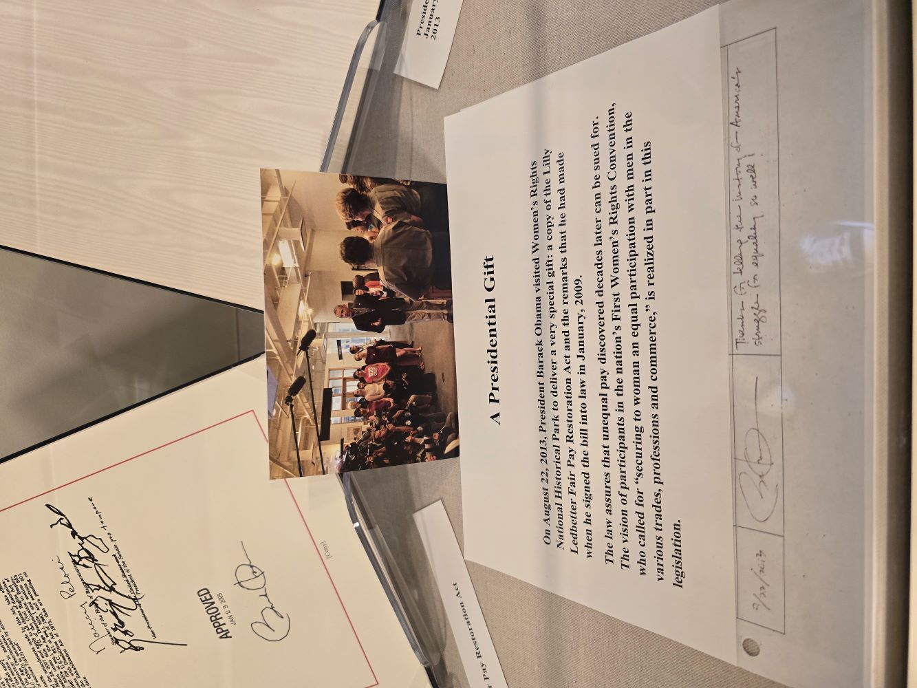 On August 22, 2013, President Obama visited the site and presented a special gift — a copy of the Lilly Ledbetter Fair Pay Restoration Act he signed in 2009, ensuring wage discrimination claims could still be filed decades later. The gesture symbolically linked the act to the spirit of the 1848 convention.