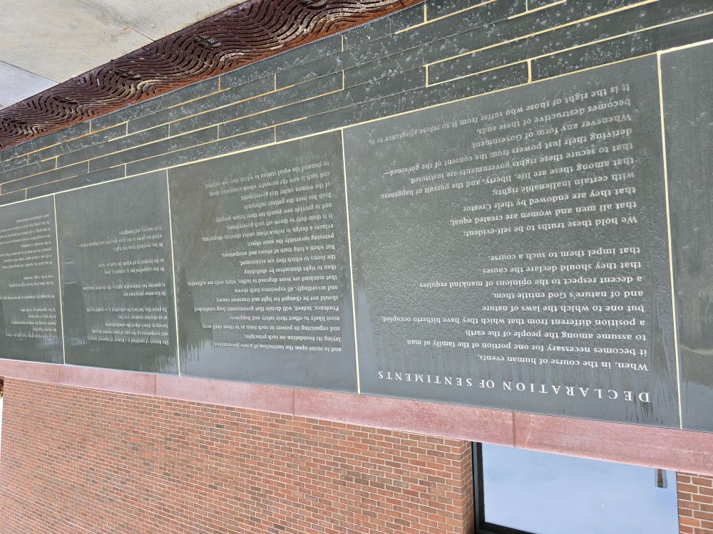 Outside the Visitor Center, a courtyard wall displays the full text of the Declaration of Sentiments.