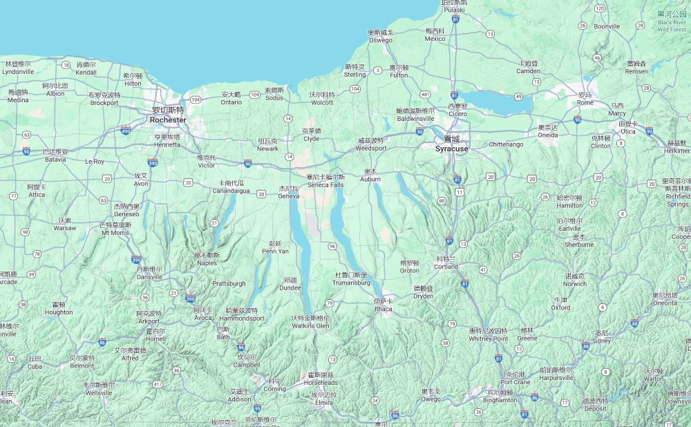 From the map, you can see a series of long, narrow, north–south oriented lakes in this area — aptly named the Finger Lakes.1 Among them, Seneca Lake and Cayuga Lake are the largest. Of course, they’re still dwarfed by Lake Ontario to the north, one of the Great Lakes.