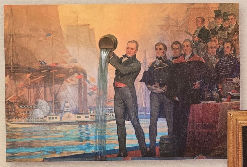 The canal faced fierce political opposition and daunting natural obstacles. Critics mocked it as “Clinton’s Ditch.” When it was finally completed, Clinton staged a bit of performance art: leading a ceremonial flotilla from Buffalo to New York City, he poured a barrel of Lake Erie water into the Atlantic Ocean — a symbolic “wedding of the waters.” The celebrations along the route were enormous. On the return trip, the ship brought back a barrel of seawater to pour into Lake Erie.