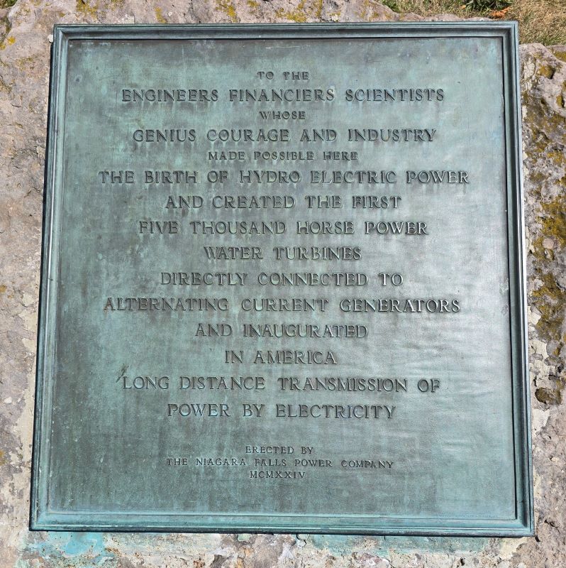 A 1924 memorial stone honoring the engineers, financiers, and scientists behind the Niagara Falls Power Company.