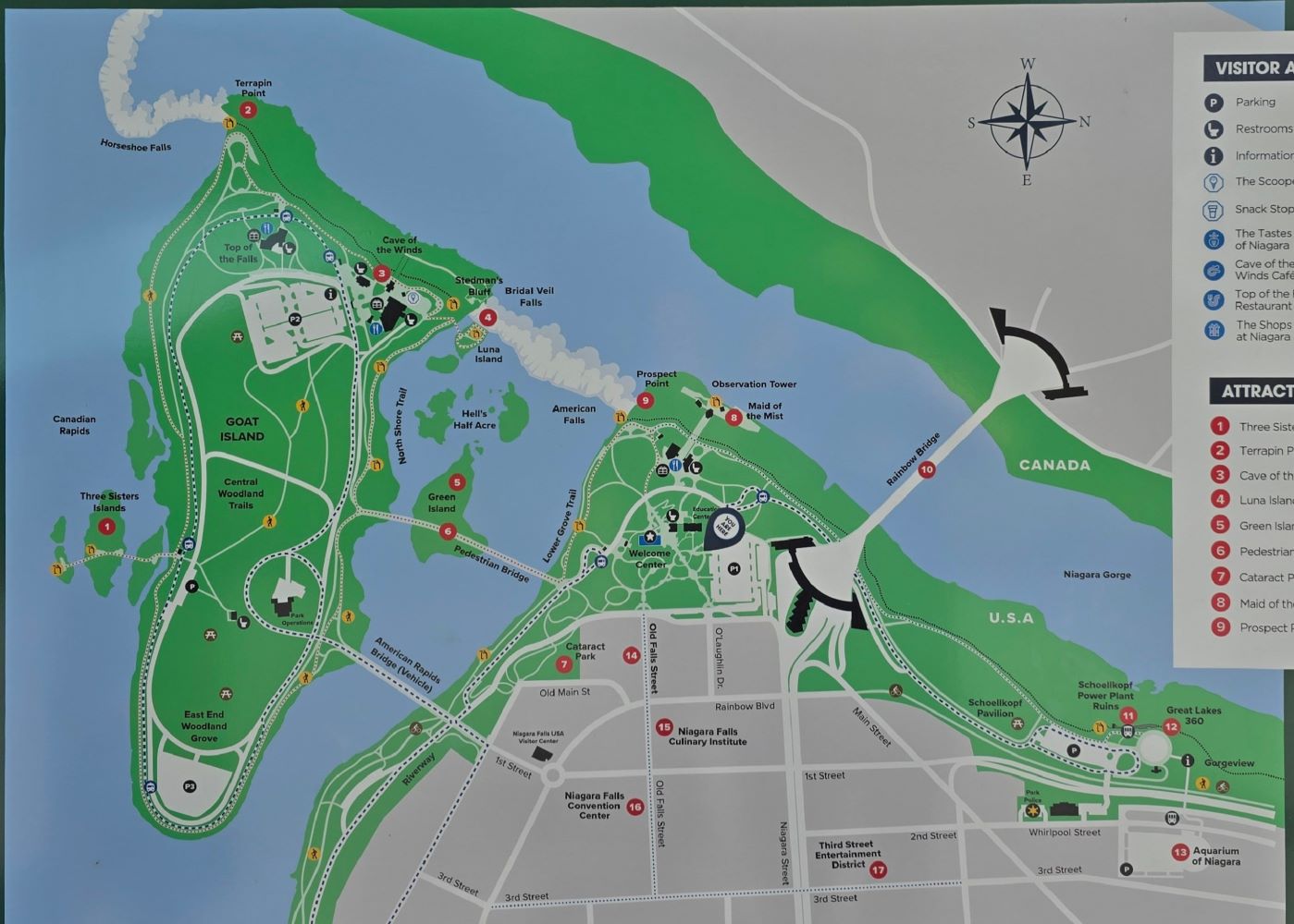 Note that the top of the map points west. Across the river lies Canada. Yes — at this spot, Canada is actually west of the U.S. (Fun fact: near Detroit, there’s a section of the border where Canada is south of the U.S.!) Both cities on either side of the river are named Niagara Falls — distinguished by “NY” and “Ontario.” The Niagara River flows roughly east to west, splits around Goat Island (the green island on the left of the map), plunges over the cliffs to form the falls, then turns north. The border runs down the middle of the river. The Horseshoe Falls (on the left) belongs to Canada and carries about 90% of the river’s water. Goat Island and the American Falls on the right belong to the U.S. Near Goat Island is tiny Luna Island (Point 4), separating the Bridal Veil Falls — the smallest of the three.