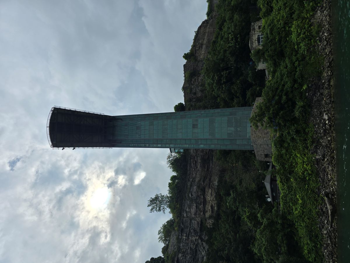 Inside, an elevator took us back down to river level. Turning around, we could see the elevator shaft built right into the cliff.