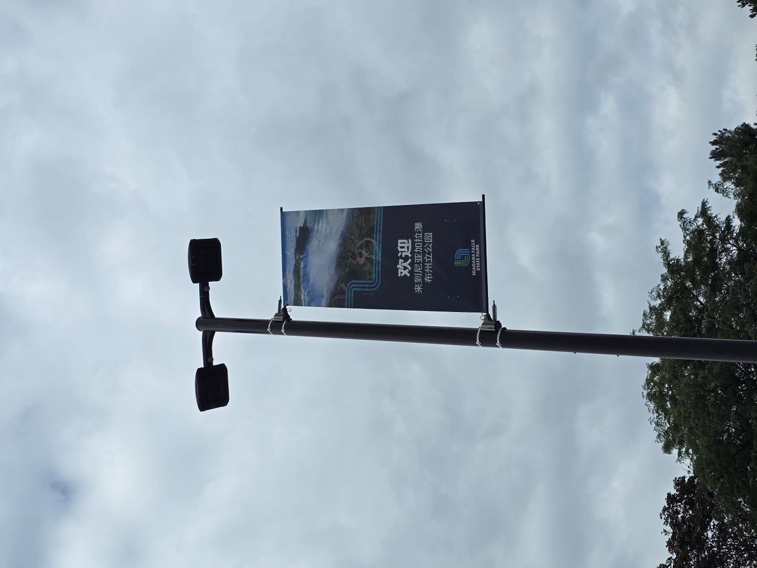 The parking lot lamps greet visitors in multiple languages, including Chinese — a heartwarming touch.