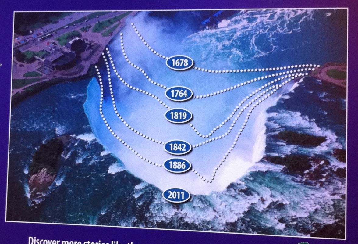 10,000 years ago, the falls were located near today’s power plants. Erosion has moved them 11 km southward. The Horseshoe’s iconic “U” shape developed over the last 300 years. Diverting water for power has slowed this erosion. In the distant future, the falls will retreat into Lake Erie and disappear.