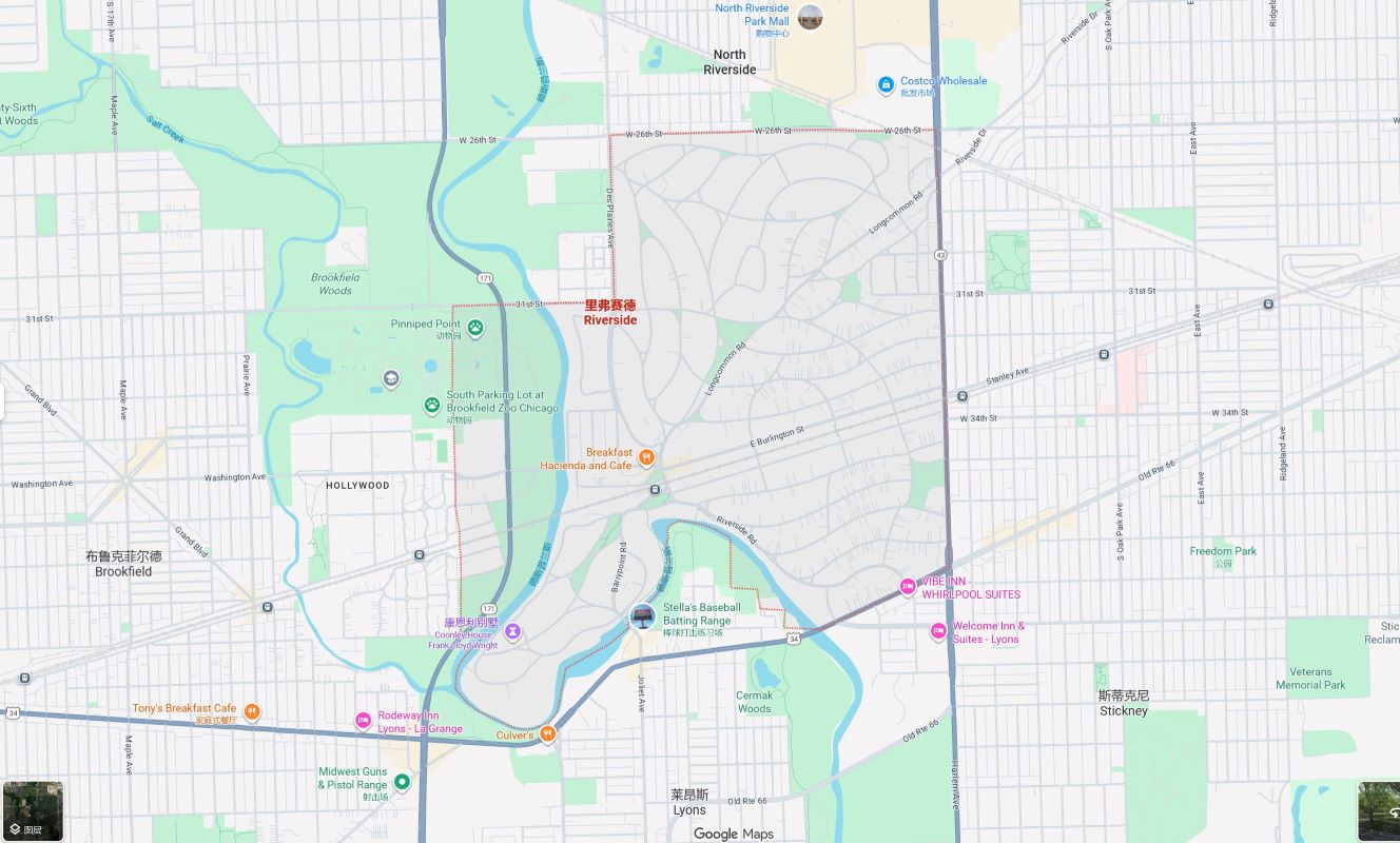 Riverside, a Chicago suburb designed by Olmsted — notice the curving roads amidst a grid of straight ones.