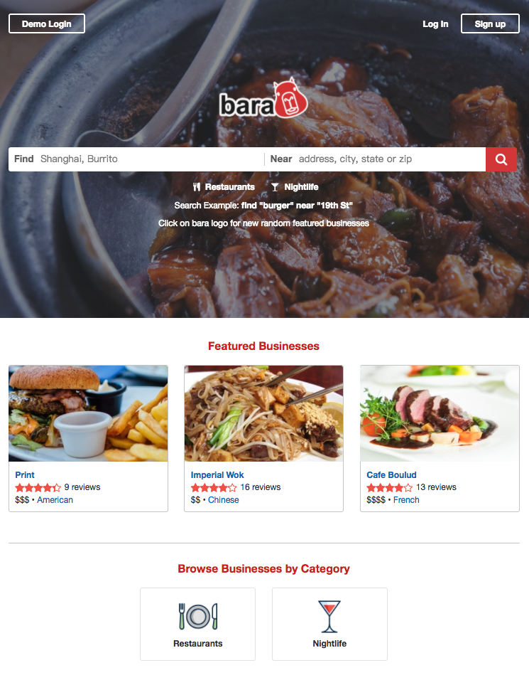 My first full stack project is Bara, a single-page Yelp clone. After weeks of development and refactoring, I am pretty happy with the result. The UI looks good; the functionality works fine: users can sign up, log in, CRUD businesses and reviews.
